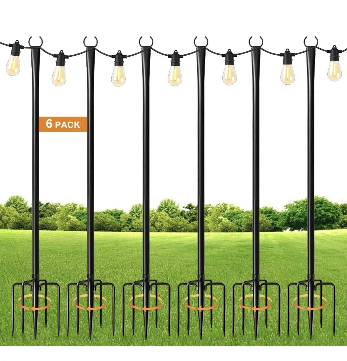 In-Ground Light Poles: These 9’ tall light poles have a pronged base which are inserted into the ground in order to keep in place. This package comes with a set of 6 poles and 6 sets of 25’ Bistro String Lights. Rent this set for a full day for $100. Contact us for a quote to add additional bases and lights.