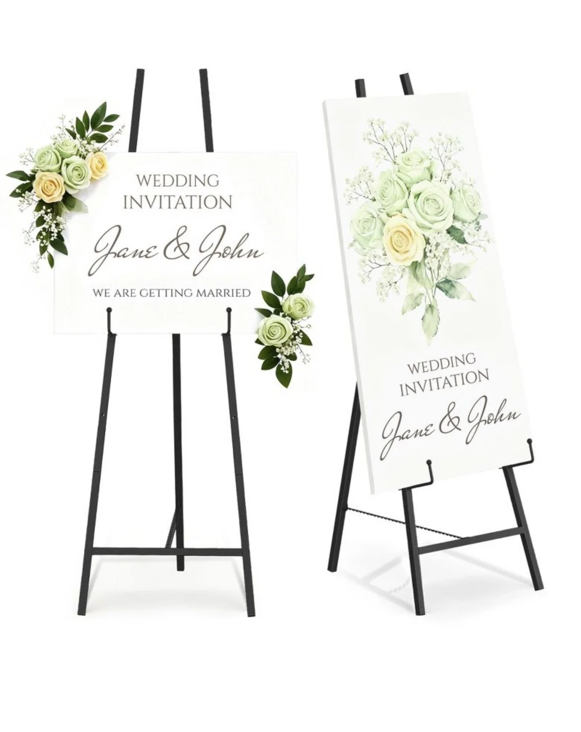 Our adjustable height sign easels provide a simple, elegant way to display welcome signs, seating charts, menus, or event details. Designed to be versatile and easy to style, these easels work beautifully for weddings, birthday parties, showers, and corporate gathering. Each easel features 3 height settings: 20”, 36”, and 38”, contains a flexible chain for precise angle adjustments, and is made of reinforced steel. Easels available in black or gold.